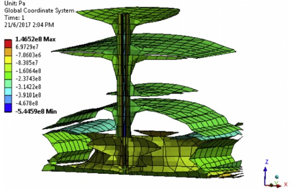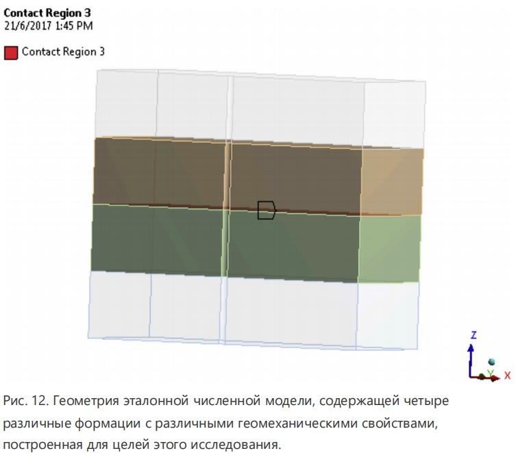 Численное моделирование этого исследования было выполнено с использованием ANSYS workbench, который является коммерческим программным обеспечением конечных элементов. Учитывая тот факт, что соляная ползучесть происходила во время бурения и до заканчивания, четыре формации без заканчивания были смоделированы как часть этого исследования. Элементы формации содержат дополнительную степень свободы для размещения порового давления во время моделирования. Предполагалось, что процесс бурения накладывает различное давление ствола скважины (давление плотности раствора) на внутреннюю поверхность каждой формации, чтобы предотвратить любую нестабильность. В этом случае плотность раствора, сообщенная в Таблице 1, была рассмотрена и применена к каждой формации. Рис. 12 показывает геометрию эталонной модели, сгенерированной в ANSYS.