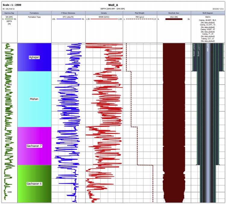 Как видно из Таблицы 1, плотность раствора в интервале формации Гачсаран 6, которая в основном является галитовой формацией с вязкостью 10^15–10^19 Па·с, была увеличена до 19.4 PPG, чтобы предотвратить закрытие ствола скважины во время бурения. Рис. 2 показывает типы формаций, обычные каротажи, плотность раствора, состояние ствола скважины и дизайн заканчивания скважины после бурения.