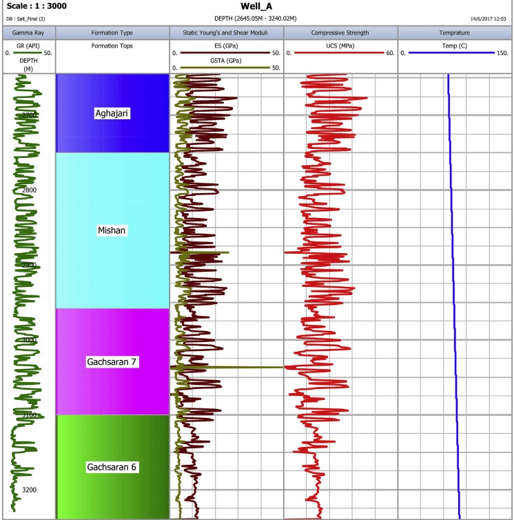 В этом исследовании UCS формаций в Скважине А были оценены с использованием различных хорошо известных корреляций, таких как представленные Bradford et al. (1998), Horsrud (2001), Golubev and Rabinovich (1976). Предсказания, предоставленные этими корреляциями, были затем калиброваны против лабораторных механических тестов, проведенных Mehrgini et al. (2016) на образцах Гачсаран. Согласно Mehrgini et al. (2016), UCS соли варьируется от 30 до 40 МПа, в зависимости от глубины, с которой они были взяты. Эти значения хорошо совпадали с прочностью, оцененной корреляцией Bradford et al. (1998) для формаций Гачсаран 6 и Гачсаран 7.