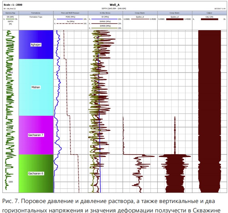 Построение графика отношения эквивалентного (фон Мизеса) напряжения к напряжению сдвига против гомологичной температуры на карте деформации указало, что ползучесть останавливается на стадии релаксации (упругая/вязкоупругая) из-за недостаточной температуры забоя и короткого временного масштаба (т.е., менее 5 дней) бурения соляной формации (Гачсаран 6). Первичная деформация ползучести, полученная из Ур. (4), построена для интервалов эвапоритов (Гачсаран 7 и Гачсаран 6) на 5-й и 6-й дорожках Рис. 7.