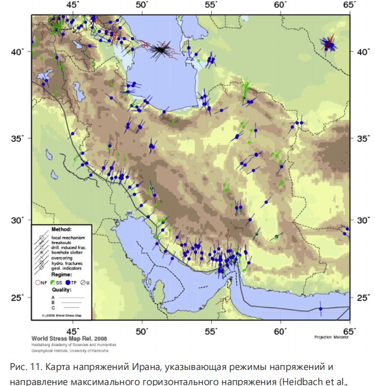 Это указывает на тот факт, что существует сдвиг режима напряжений от сдвигового (σH > σv > σh) к нормальному напряжению (σv > σH > σh) в Скважине А, как показано на Рис. 7 и 10, что может быть связано с присутствием соли. Это также согласуется с картой напряжений Ирана, показанной на Рис. 11, где поля на юго-западе близко к Персидскому заливу отмечены режимами сдвигового разлома. Как упоминалось ранее, соль может вызывать локальное возмущение величин напряжений in-situ и вращать их направления. Это изменение режима напряжений также может быть связано с присутствием разлома, пересекаемого Скважиной в области (Salehi et al., 2009). Следовательно, требуются дальнейшие исследования, чтобы понять причину внезапного изменения режима напряжений в этой Скважине.