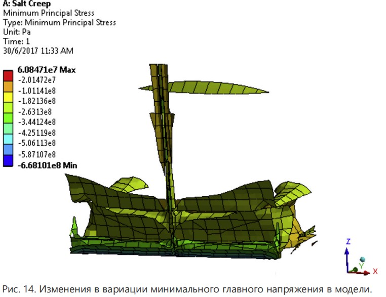 Учитывая тот факт, что аналитический метод, представленный ранее, предоставил хорошее совпадение с закрытием ствола скважины, захваченным каверномерным логом, были запущены численные симуляции для проверки точности результата. Рис. 13 и 14 отображают изо-поверхность нормального и минимального главных напряжений, полученных после моделирования, тогда как Рис. 15 изображает кривую скорость деформации-время модели конечных элементов.