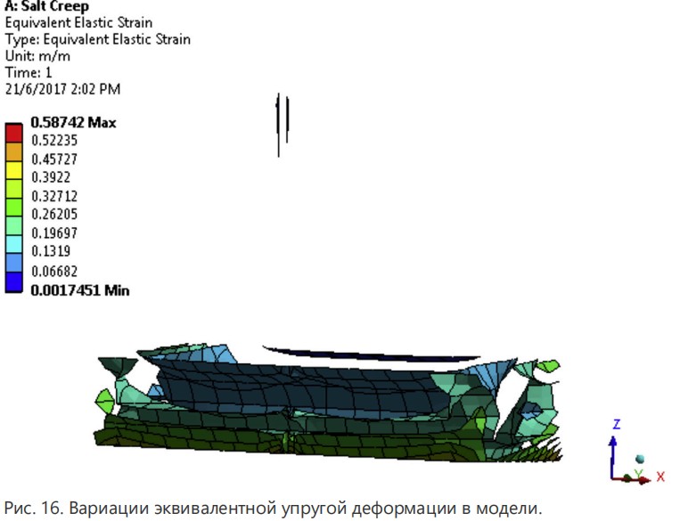 Согласно этим результатам, вязкоупругое поведение соли, по-видимому, является причиной разрушения ствола скважины в течение пяти дней бурения в соляной формации. Это был тот же самый вывод, сделанный аналитической моделью. Рис. 16 показывает вариацию эквивалентной упругой деформации в модели, особенно в соляной формации.