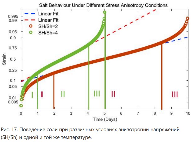 Было, однако, другое важное заключение, сделанное численным моделированием для эффекта анизотропии напряжений на поведения соли. Как упоминалось ранее, предположение, часто сделанное для соли, состоит в том, что анизотропия напряжений не существует в соляных интервалах. Напротив, результаты, полученные из численного моделирования, указали, что соль может поддерживать напряжение сдвига, созданное дифференциальным напряжением, до некоторой степени, и изменения в анизотропии напряжений будут существенно влиять на поведение соли, как показано на Рис. 17. Как matter of fact, чем больше анизотропия напряжений, тем быстрее была бы соляная ползучесть и тем выше шанс закрытия ствола скважины в очень короткий период времени.